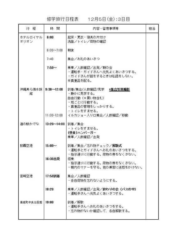 第2学年の中でも最大の行事である修学旅行がやってきました。5月にあった遠足や、文化祭などで戦争や平和について学習してきました。今回の修学旅行で、これまでの平和学習を生かし沖縄で学んできましょう。みんなが一つになって全員で一生の思い出に残るものにしましょう。みんなで楽しい修学旅行を作り上げましょう。