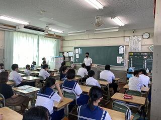 ゲストティーチャーから、会社の説明や会社が作っている製品やサービスなど生徒に知ってもらいたい内容とともに、仕事を選んだきかっけ、中学生に興味を持って欲しいこと、頑張って欲しいことなどを伝えていただきました。