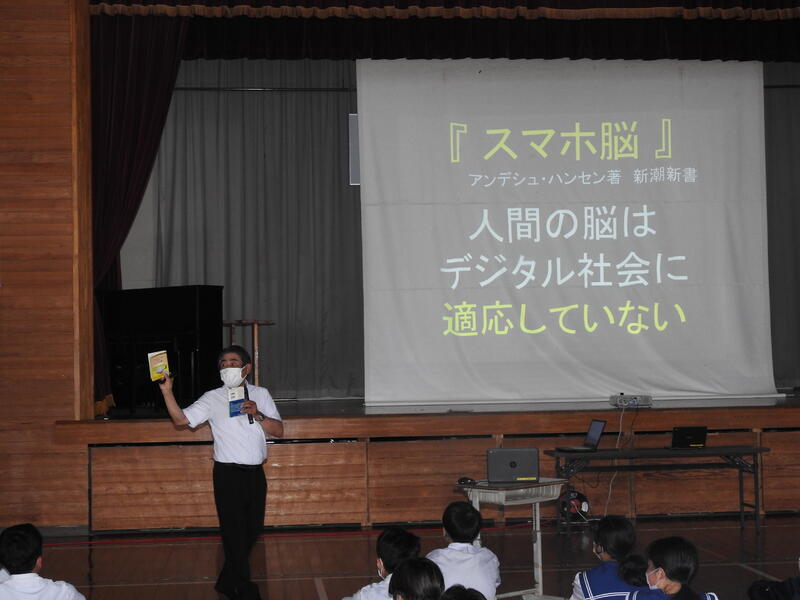スマートフォンの過度の使用による学力低下、スマホ依存の恐ろしさ、そしてSNSにおけるトラブルなどについて話をしていただきました。