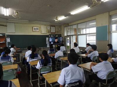 リモート配信で講話をしていただきました。選挙の歴史や投票の仕方をクイズ形式などを用いて楽しくわかりやすく説明していただきました。