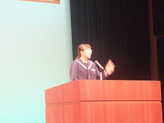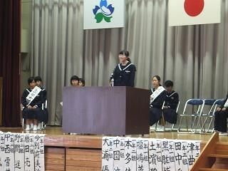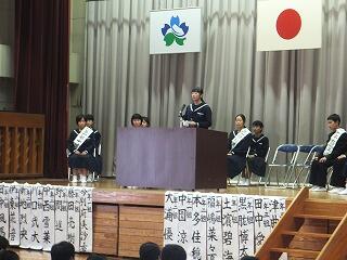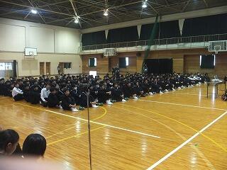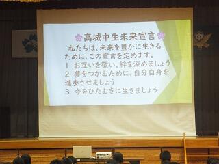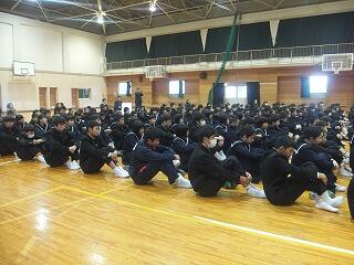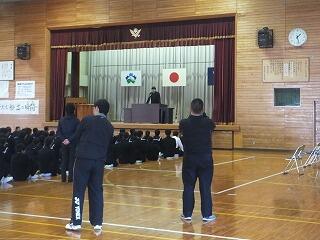 1月17日(金)は、体育館で生徒集会を行いました。はじめに女子ソフトテニス部の女子1ペアが地区対抗予選大会で3位入賞を果たし、表彰されました。次に、生徒全員で高城中生未来宣言を朗読し、生徒会役員、専門委員会正副委員長が今年1年間の活動について抱負を述べました。各種行事のリーダーとなり、生徒会員の力をまとめ、高城中の伝統を築いていってくれることを約束してくれました。そのあとは、高校入試が迫ってきている3年生に、1・2年生全員でエールを送りました。3年生が自分の力を十分発揮して、合格してくれることをみんなで応援しています。