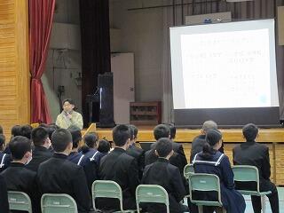 各学年代表と生徒会役員代表による2学期の反省等がありました。その後、校長先生がパソコンの画面を使って話をされました。有意義な冬休みを過ごしてください。