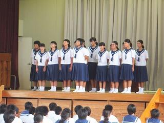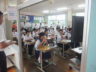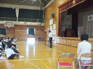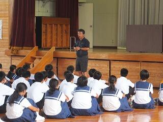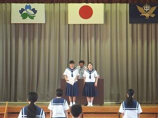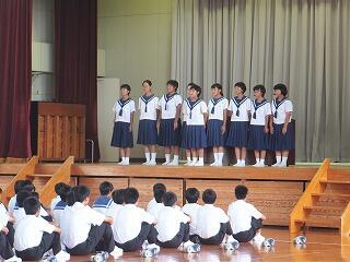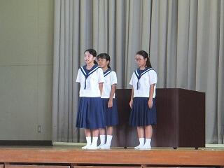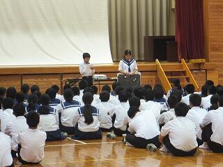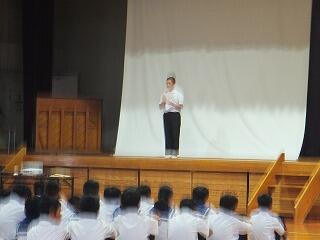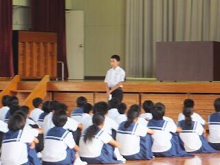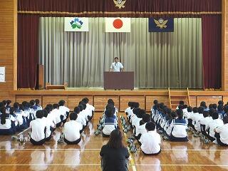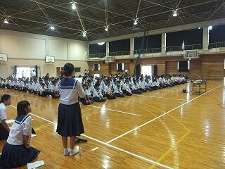 1日は、夏休みに入って最初の登校日でした。朝の会や清掃をしたあと、全校集会を行いました。まず、はじめは県中総体で3位入賞を果たした女子ソフトテニス個人ペアの表彰を行いました。そして、その2名が九州大会に出場することやオーストラリアに派遣される生徒のことなどを校長先生が紹介されました。その他にも、地区で行われる行事やボランティア活動に進んで参加し、それぞれが成長できる夏休みにしてくれることを期待していると話されました。また、生徒指導主事の先生が、あらためて夏休みの過ごし方で気をつけることを3つ話されました。1つ目は規則正しい生活を送り健康に過ごすこと。2つ目は水や交通事故に気をつけること。3つ目はSNSを介したトラブルが多くなることを踏まえ、相手の気持ちを考えるということでした。以上の話しを忘れず、残りの夏休みが有意義に過ごしてください。