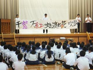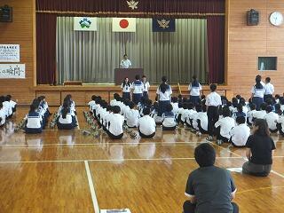 9月19日(水)5校時終了後、地区中体連秋季大会に向けた推戴式を行いました。畠田樹里さん(女子バレー部主将)が立派に選手を代表して宣誓をしてくれました。各部活動の活躍を期待します。