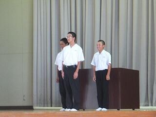 夏休み中に行われた部活動の大会や1学期中に行われたSCT(理科)の表彰が行われました。その後、校長先生の話がありました。