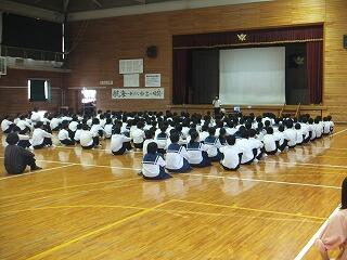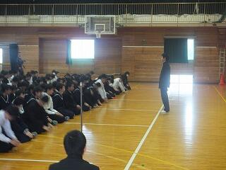11月28日(木)は、体育館で薬物乱用防止教室を行いました。始めにデンサンの方に情報モラルについて気をつけることを話してもらいました。次に、都城警察署生活安全課の方に薬物のことについて説明をしていただきました。中学生といえども、どちらのことも身近な問題であることを認識しておかなければなりません。これからの生活の中で、誘われてもきっぱりと断ることが大切であることを学びました。また、その場から立ち去ることも、自分の身を守る行動であることを学びました。今回の学習が、皆さんの人生に、よりよく生かされることを願っています。
