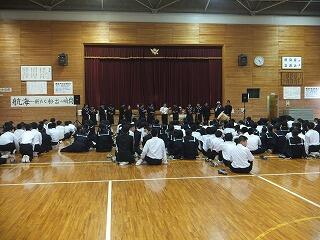 校長先生や養護教諭からの話があり、その後、九州大会に出場する「男子ソフトテニス部」・「吹奏楽部」の激励式を行いました。