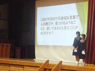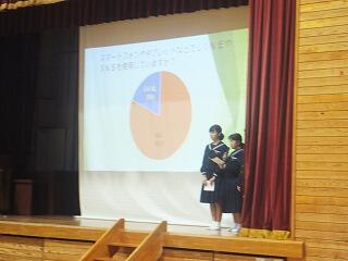 12月6日(金)に、全校生徒が集まり、生徒会主催で「命について考える集会」を行いました。人間関係で悩んだことについて事前に行ったアンケート結果を全員で確認したあと、場面劇を見て、話し合いをしました。悪口や陰口を言われている場面や無視をされている場面、目上の人への言葉遣いが悪い場面を見ながら自分はどのような態度や行動をすれば友人関係をよくできるのかを考え、発表したり、感想を書いたりしました。