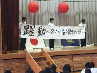 7月14日(金)、第68回宮崎県中学校総合体育大会・県吹奏楽コンクールに向けて、推戴式が行われました。野球部・サッカー部・男子バスケ部・男子ソフトテニス部・水泳部・バドミントン部・吹奏楽部のみなさんの活躍を期待します。