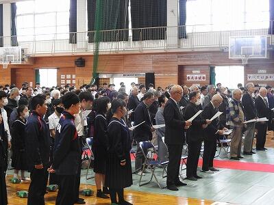 11月16日(木)、昭和38年度に本校を卒業された約50名の先輩方が、61年ぶりに高城中学校の門をくぐられました。在校生一同でお迎えし、短い時間ではありますが交流を行い、一緒に「ふるさと」と「校歌」を歌いました。