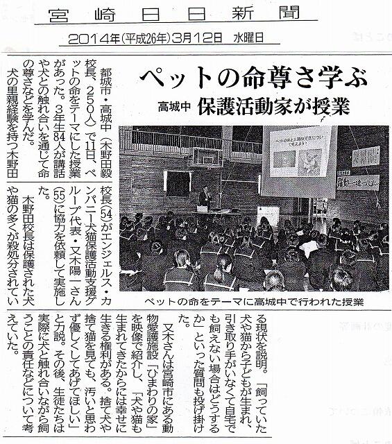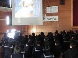 5・6校時、3年生全員を体育館に集め、「ペットの命と人間の責任について考えよう!」という課題のもと、授業が行われました。