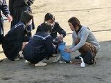 6班に分かれ、前半は、倒れた人役(倒れた状態、骨折、出血など)に最初に気づいた中学生がどう声かけをして、通りかかった人や近所の人とどのように連携していくかという内容。後半は、身近な物を使っての応急処置(止血、竹竿と毛布での簡易タンカなど)臨機応変にいかに対応していくか、という実践的な研修が行われました。声かけ、人に援助を求めるといったコミュニケーション力が必要であることがわかりました。