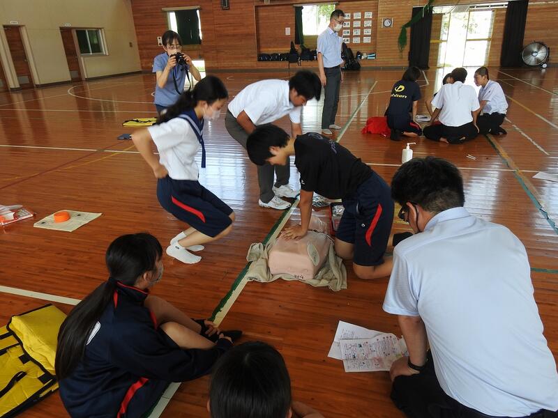 7月10日(月)に本校体育館にて、救急救命講習を実施しました。日本赤十字社ボランティアの坂元透様が、一次救命処置の仕方を教えてくださいました。