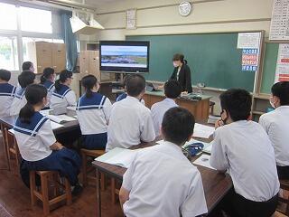 ゲストティーチャーから、会社の説明や会社が作っている製品やサービスなど生徒に知ってもらいたい内容とともに、仕事を選んだきかっけ、中学生に興味を持って欲しいこと、頑張って欲しいことなどを伝えていただきました。