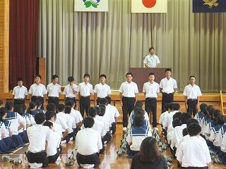 校長先生や養護教諭からの話があり、その後、九州大会に出場する「男子ソフトテニス部」・「吹奏楽部」の激励式を行いました。