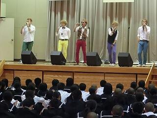 11日(火)の午後は鑑賞教室でした。今回は、男性5人のアカペラグループ「JARNZ」の公演でした。このグループは、TV番組の「ハモネプ」で優勝したことをきっかけにプロとしての活動を始めたそうです。鑑賞教室は、まずAKB48の”ポニーテールとシュシュ”のカバーからスタート。それから、今年大流行した”妖怪体操”や”Let it go”をはじめとする、みんながよく知っている曲をたくさん歌ってくれました。もちろんオリジナルの曲もありました。曲の間には、「歌をやめようと思ったけれど、ある曲に出会えて、これまでがんばってこれた」という話や「高校生の時不登校になって、お母さんにずいぶんあたってしまったけれど、今そのことをとても後悔している」といった自分たちのことも話してくれ、そのエピソードにまつわる曲も歌ってくれました。エピソードを聞いた後の歌はとても心に響くものでした。また、どの曲も自分たちの声だけとは思えないほど迫力のある歌声と、さすがプロだと思わせるようなうまさに聞き入ってしまいました。最後に文化委員長のお礼の言葉とともに、合唱コンクールで優勝した3年3組が合唱をしました。すると、アンコールでJARNZの皆さんがフロアに降りてきて、マイクなしで歌ってくれました。