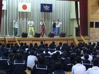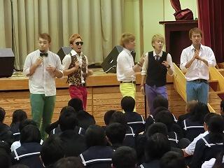 ○今日は、「ジャーンズ」というアカペラの歌手グループが来ました。おもしろい話もためになる話もしてくれました。でも、一番すごかったのは、やっぱり歌です。楽器を使っているようですごかったです。