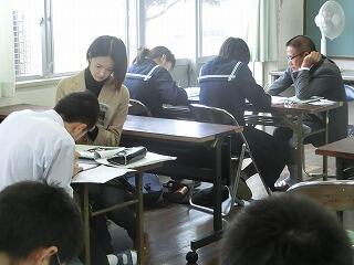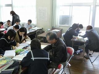 高城中学校の図書閲覧室で、土曜日午前中(9:00~11:00)、学習支援を行います。生徒は、希望参加です。宿題をもってきたり、課題をやったりと、基本は自学自習です。地域の学習ボランティアの方々に、質問があったり問題が解けずに困っていたりするときに、ちょっと手助けしていただいています。
