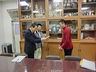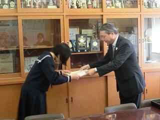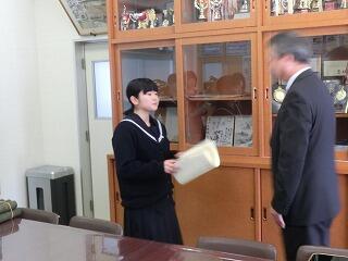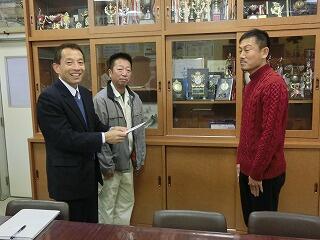 昨日:12月7日(金)、田中友和様・持井康様・首藤裕一郎様(平成3年度本校卒業生代表の方々)から寄附金をいただきました。ありがとうございました。生徒のために大切に使わせていただきます。 (右から3名が、平成3年度本校卒業生代表の方々です。)