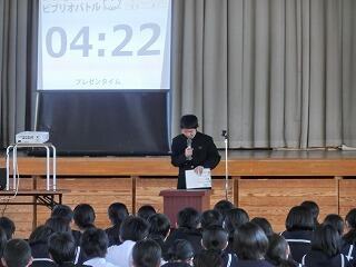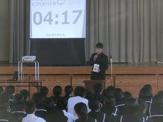 昨日:12月20日(水)、読書集会において、5名の生徒が、一人ずつお気に入り本の紹介をしました。その紹介を聞いて、どの本が読みたくなったかを全校生徒が投票しました。冬休みに読んでみてはどうでしょうか。