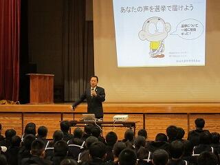 11月18日(月)は、都城市選挙管理委員会の2名の方々から選挙の出前授業を受けました。なぜ、選挙があるのか? 選挙に行かないとどうなるのか? 18歳から選挙権が与えられていることなどを話してくださいました。21日は生徒会役員立会演説会と選挙が行われます。この学習を通して学んだことを念頭に置き、真剣な態度で臨んでほしいと思います。