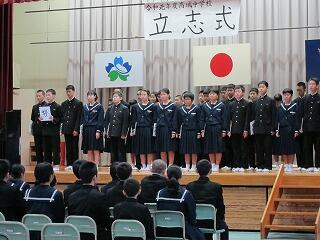 2年生は、2月17日(月)に、多数の保護者の方に参観をいただきながら、「立志式」を実施することができました。校長先生のあいさつでは、論語から引用した「恕(ジョ)」を示しながら思いやりのある生き方を望んでいることを話されました。第1部では、生徒全員が立志の誓いを発表しました。これから自分が望む生き方を漢字一字で表し、その理由を述べました。そのあと、「いのちの歌」を合唱し、これまでの14年間を映像で振り返りました。第2部では、宮崎食研代表取締役 田原敬介様の講演でした。