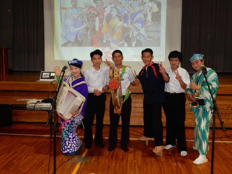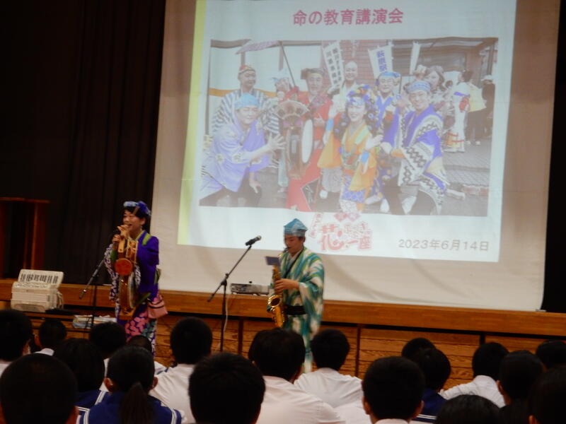 講話は、前半がチンドンの紹介や体験でした。生徒は楽しく笑顔で、チンドンの世界に夢中になっていました。