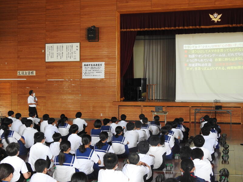 スマートフォンの過度の使用による学力低下、スマホ依存の恐ろしさ、そしてSNSにおけるトラブルなどについて話をしていただきました。