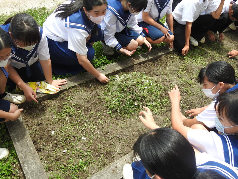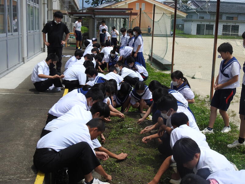本日昼休みを返上して、全校の生活委員会と環境委員会の生徒が、暑い中一生懸命草抜きを行ってくれました。