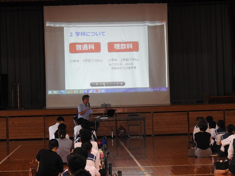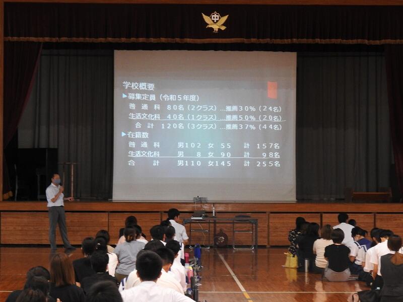本日本校体育館にて第3学年生徒及び保護者を対象に、高校説明会を実施しました。5月は私立高校、本日は県立高校を中心に説明していただきました。進路選択の参考になりました。