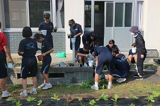 これは5月29日(金)の徒総会で決議した、「一人一鉢運動をして社会貢献する。」に基づいて実施したものです。このような状況の中ですので、残念ながら、育てた花を地域のいろいろなところに配ることはできません。そこで今年度は、育てた花を両親や祖父母、家族などにプレゼントする予定です。