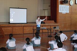1校時に体育館でオリエンテーションを実施しました。小・中学校両校長の話があり、その後、確認事項の説明、部活動紹介がありました。3校時は、中学校の先生による算数(数学)と理科の、小学生向け授業でした。