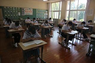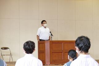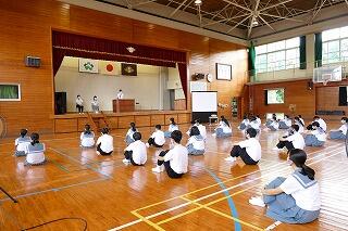 9月30日(木)5・6校時、家庭科の一環として、「災害に備える」の授業を実施しました。都城市役所総務部危機管理課の方をお迎えして、体育館で実施しました。全校生徒と、職員も全員参加しました。