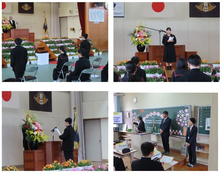 4月8日、新任式・始業式がありました。校長、教諭2名、事務職員2名、日本語サポーターの計6名の転入者の紹介があり、転入された先生方から有水中学校への思いを話してもらいました。
