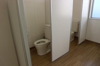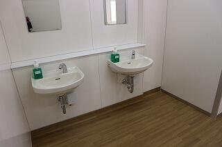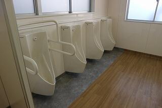 今回のトイレは乾式で、清掃等で床に水は流しません。乾式トイレとは、「床がシート材(抗菌)であり、水を流さず常に乾燥しているため、菌の増殖が抑えられる。」というものです。そのほか、トイレと通路の照明、小便器、手洗い場の水道は自動です。便器はすべて洋式です。