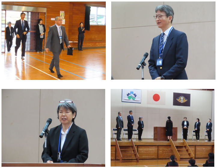 4月8日、新任式・始業式がありました。校長、教諭2名、事務職員2名、日本語サポーターの計6名の転入者の紹介があり、転入された先生方から有水中学校への思いを話してもらいました。