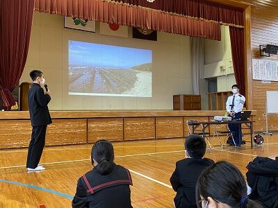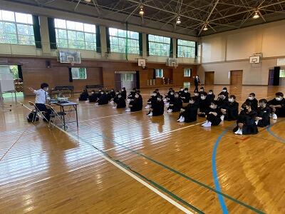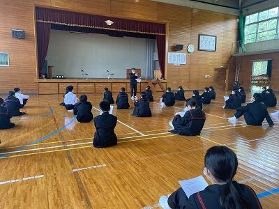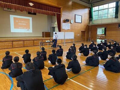 都城警察署の笠牟田様に来校していただき、交通安全についてのお話をしていただきました。