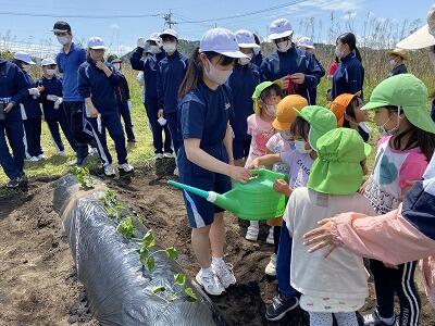 散歩途中で参加した、こども園のみんなもお水をあげましょう!