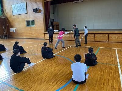 訓練のあと、真剣に話を聞いています。隅っこにいるピンクのシャツの田原先生は、不審者役をしてくださいました。