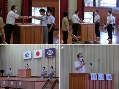 朝の会の後、涼しいうちに始業式を行いました。式に先立って、1学期末に実施した数学コンテストの満点表彰(写真①は代表者)、宮崎県中学校総合体育大会で3位となった野球部の表彰状の校納(写真②)を行いました。