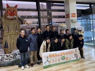 2日目は羽城中での交流を行いました。写真は宮崎・都城・山田中等の紹介をしている様子です。あちらの生徒たちも先生方も大変喜んでくれました。授業に参加させていただき、秋田県の優れた授業を肌で感じることができたのではないでしょうか。さらに、給食では、秋田県名物のきりたんぽをいただき、食文化も感じることができました。約半日と短い時間でしたが、すっかり仲良くなっているようでした。
