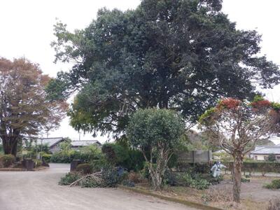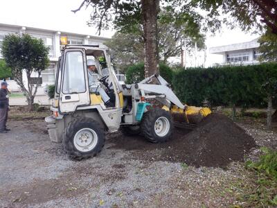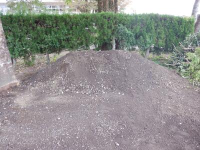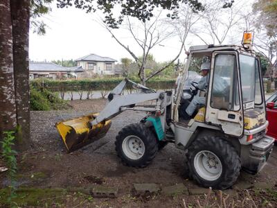 11月12日(水)、昨日の剪定作業を行っていただいた際、巨木の周辺に置かれた残土が押し固まっていて、人力で取り除くのが困難であることを相談したところ、早速、山田総合支所の方がブルドーザーで地面を平らにならしてくださいました。