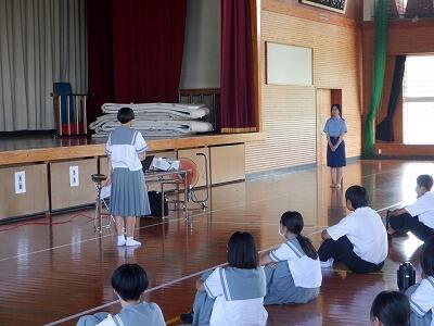 6月11日(水)、かかし笑劇団の3名の方々を講師にお招きして、秋田県潟上市交流(7月1日~3日)に参加する9名の生徒が事前学習を行いました。