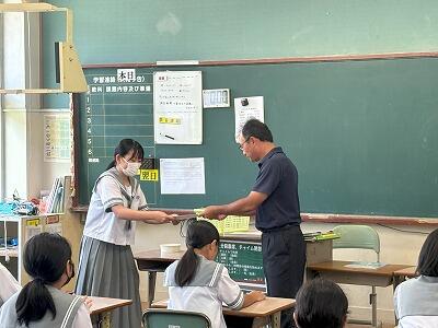 6月16日(月)、「小さな親切」運動 都城支部の代表 江夏由宇子 様をはじめ、副代表 様、事務局長 様等に御来校いただき、1年生男子1名を「小さな親切」運動で表彰してくださいました。