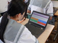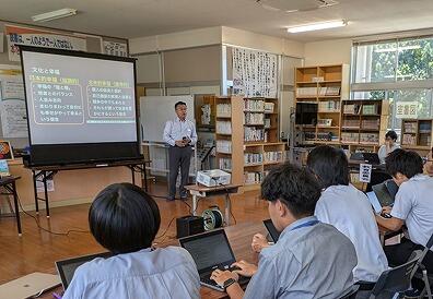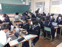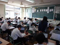 1年の国語の授業をのぞいてみました。生徒はタブレット(1人1台端末)からGoogleのFigJamを活用して、生徒の意見や考え方を共有したり、共通点や相違点に着目したりしていました。生徒一人一人の意見を可視化することで、多角的・多面的によく考えていました。