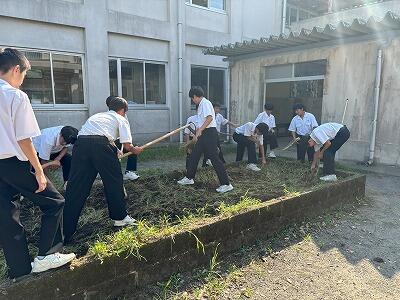 運動場や中庭の草刈りなどを行い、2学期に向けた環境整備ができました。