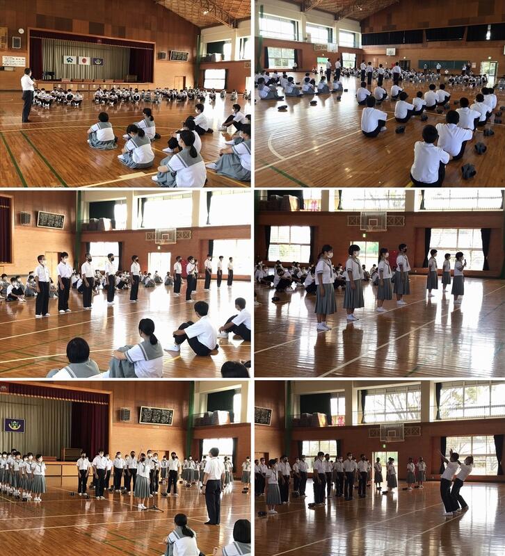 2日目は羽城中での交流を行いました。写真は宮崎・都城・山田中等の紹介をしている様子です。あちらの生徒たちも先生方も大変喜んでくれました。授業に参加させていただき、秋田県の優れた授業を肌で感じることができたのではないでしょうか。さらに、給食では、秋田県名物のきりたんぽをいただき、食文化も感じることができました。約半日と短い時間でしたが、すっかり仲良くなっているようでした。