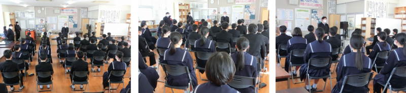 生徒会代表の福岡 翔さんは、①12月から実際の出番となった新生徒会は、秋田の交流事業という大きな行事を経験し、計画の大切さなど、引継ぎで聞いたことを実感した ②よりよい学校づくりに努めたい ③全校生徒が自分の生活態度を振り返り、充実した学校生活にしよう! と、新生徒会としての抱負とともに、全校生徒に向けて呼びかけまでしてくれました。※写真右下