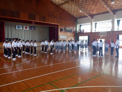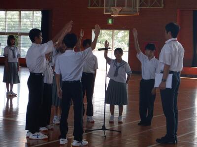 9月17日(水)、体育館において、都城地区中体連(秋季大会)の壮行会を実施しました。3年生の引退後、1・2年生の新チームで臨む大会です。新キャプテンを中心に、3年生から引き継いだチームカラーを発揮してくれることを期待しています。