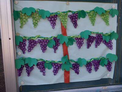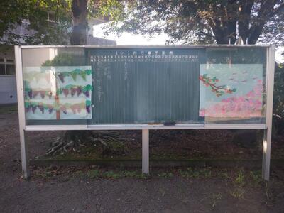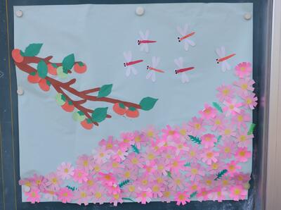 9月に入っても、まだまだ暑い日が続いていますが、正門掲示板の掲示は、一足先に秋バージョンに変更しました。秋の味覚のブドウや柿、そして、秋桜(コスモス)の花、山田の空を飛び回るトンボが上手に表現されています。